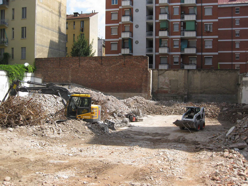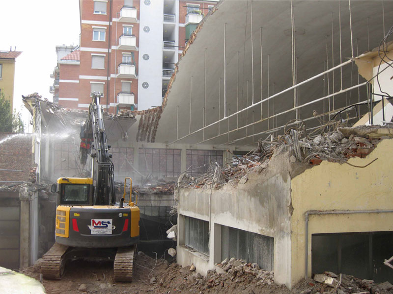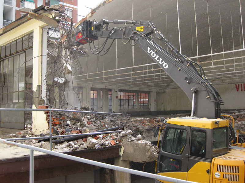 Intervento di demolizione di un edificio artigianale costituito da due piani fuori terra, eseguito con una macchina di dimensioni ridotte per poter accedere all’interno del cortile del fabbricato.