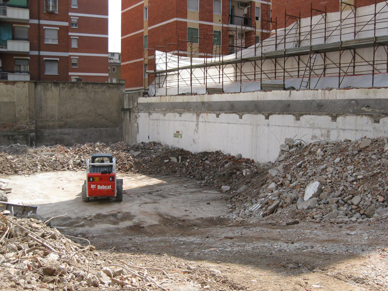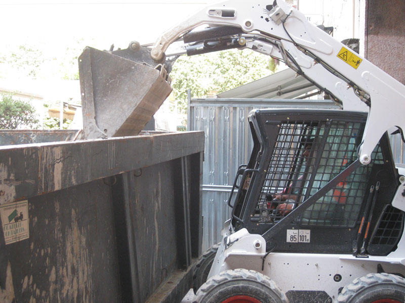Una volta terminata la demolizione eseguita tramite l’utilizzo di un Volvo 145, tutte le macerie sono state caricate mediante il Bobcat S185 e scaricate in un container depositato all’esterno dell’area adiacente al cantiere.