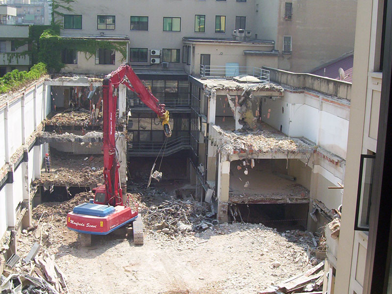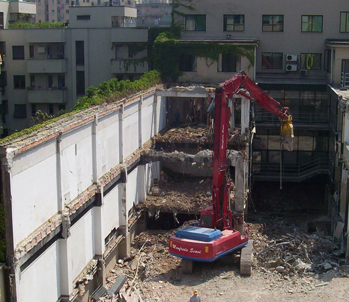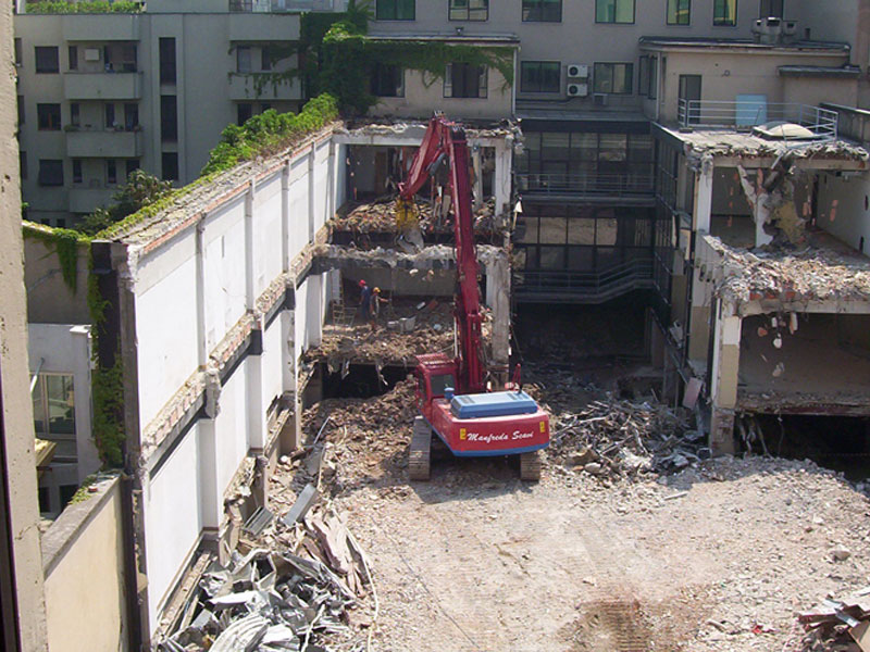 Si è provveduto a demolire una palazzina “uffici” con struttura in cemento armato. Intervento che ha richiesto la massima attenzione per la salvaguardia delle pareti confinanti alte 20mt.