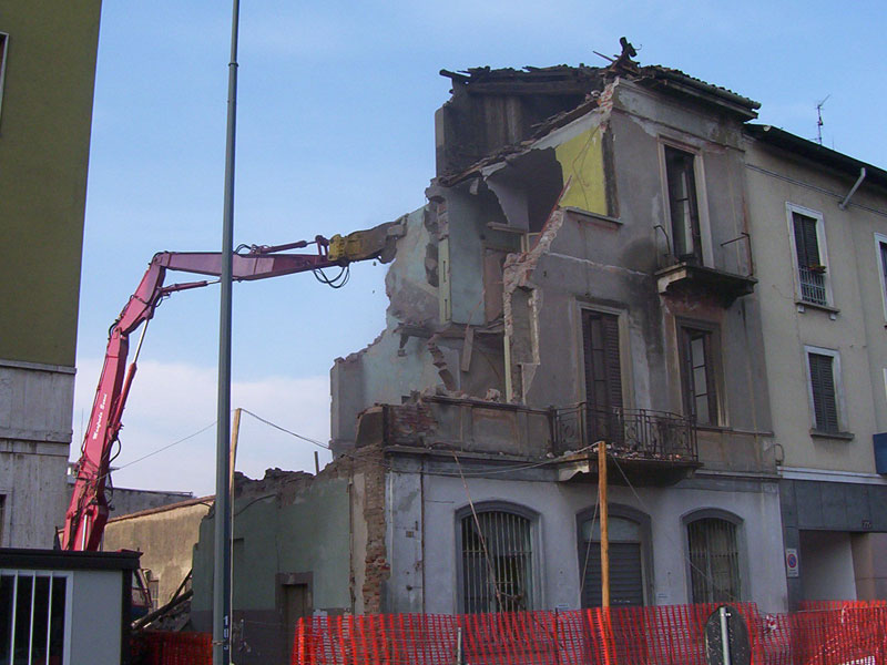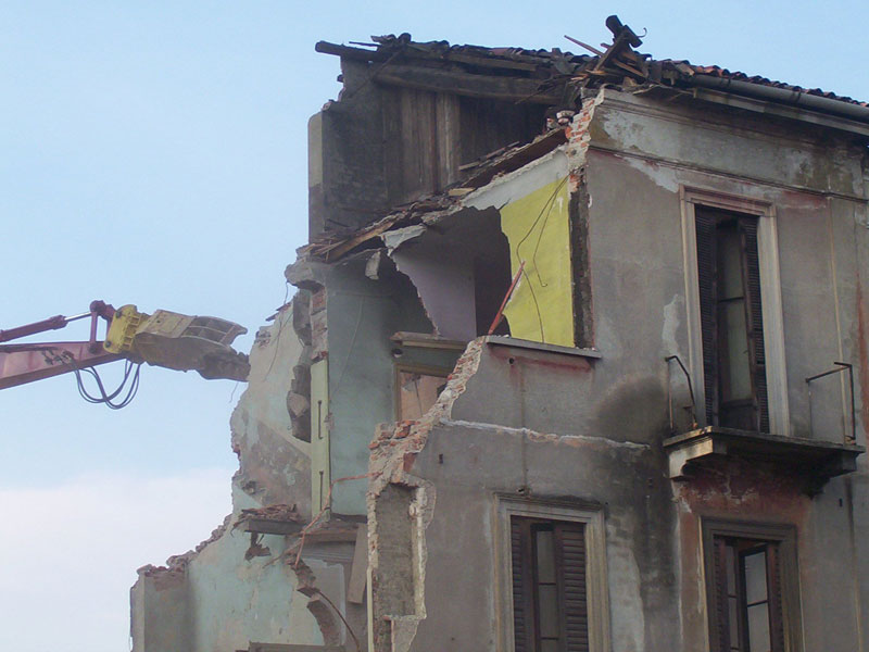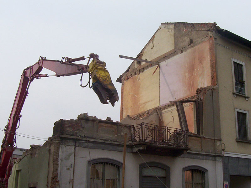 La demolizione è stata eseguita con l’utilizzo dell’Escav. Daewo 340, previo taglio con filo diamantato per l’isolamento della parete in aderenza con l’edificio confinante.