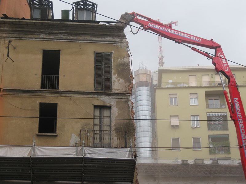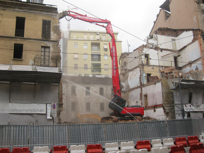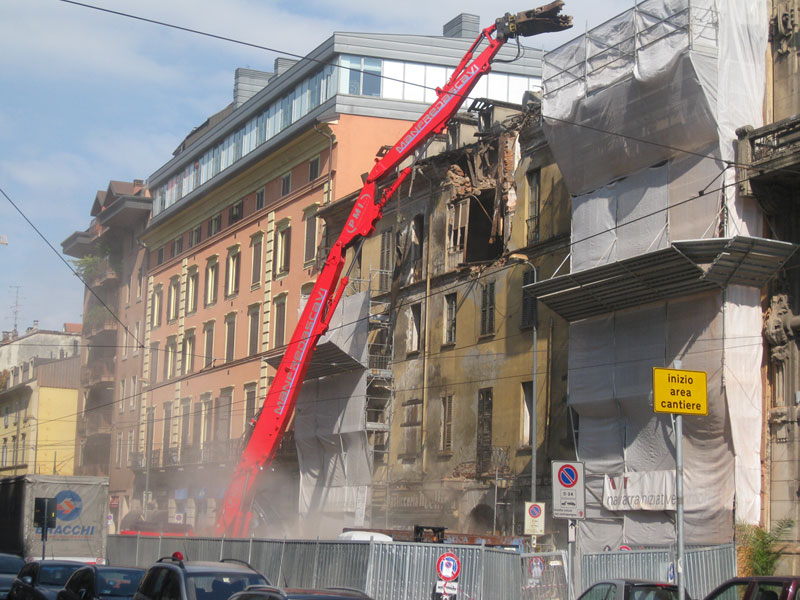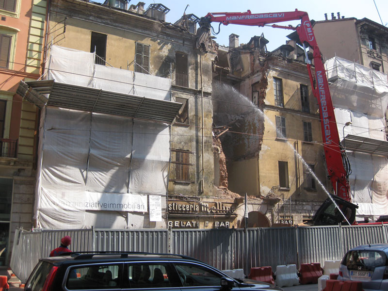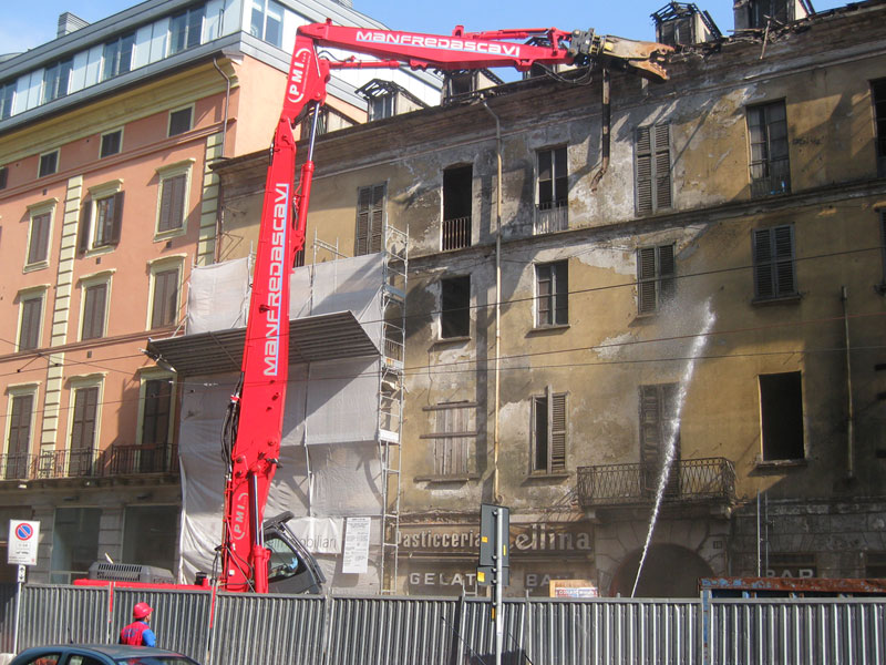 L’edificio di via Monte Grappa che abbiamo demolito, riguardava un vecchio fabbricato fatiscente realizzato alla fine dell’800 alto 19 m nella parte esterna e circa 20 m nella parte interna, con una struttura in mattoni e il solai in legno. Dopo aver ripulito internamente i locali, essendo anche in questo caso la struttura in aderenza in entrambi i lati, prima di iniziare la demolizione meccanica, al fine di garantire l’integrità degli edifici vicini si è proceduto a dividerli mediante l’uso del filo diamantato. Successivamente si è ritenuto adeguato l’impiego dell’escavatore PMI 460 Demolition, la cui prima fase dell’intervento ha previsto lo smantellamento della parte centrale del fabbricato al fine di realizzare un varco che permettesse successivamente di poter effettuare il resto delle lavorazioni internamente al cantiere per abbattere il resto dell’edificio.