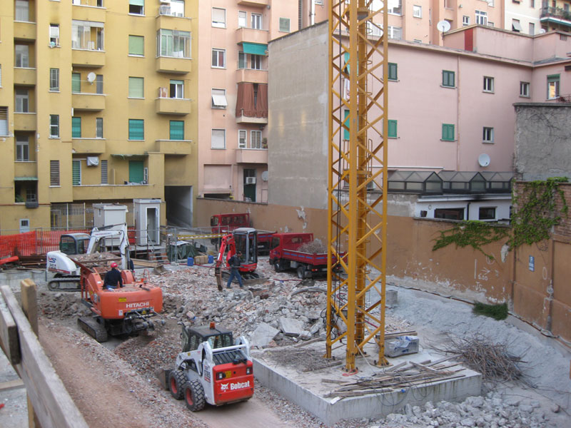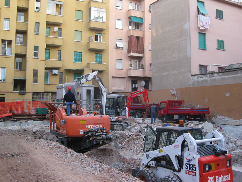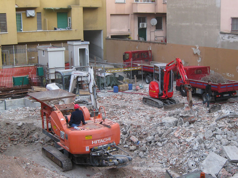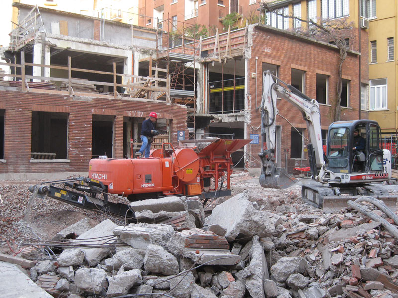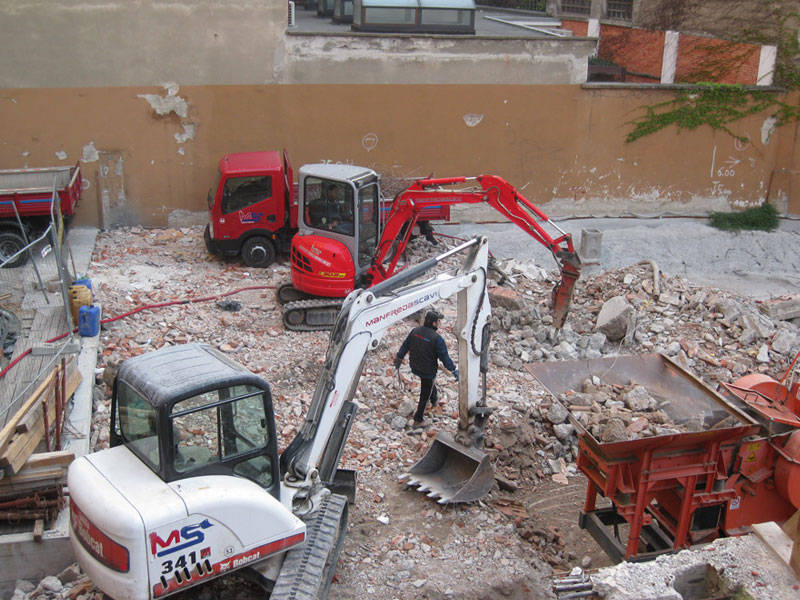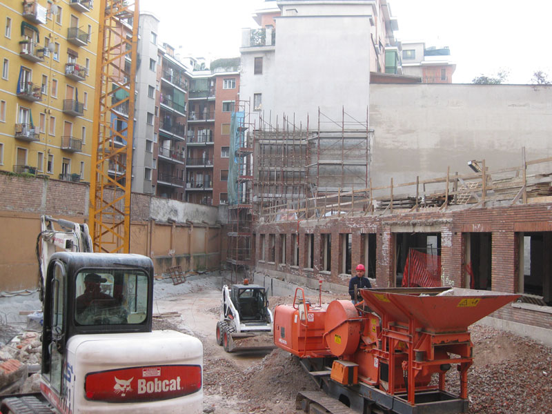 In questa circostanza era prevista la ristrutturazione di un immobile composto di due piano fuori terra e poiché il passaggio all’interno dello stabile era largo circa 2,25 m, non consentiva l’ingresso di un escavatore con braccio attrezzato, pertanto si è provveduto ad eseguire la demolizione interamente a mano. In un secondo momento della lavorazione, al fine di limitare la volumetria del materiale demolito a mano, si è ritenuto opportuno impiegare un miniescavatore e special modo un New Holland da 30 q munito di apposito martellone. Successivamente le macerie sono state caricate tramite l’utilizzo di un Bobcat 341 da 50 q e inserite all’interno di un frantoio mobile, “Hitachi X 120”. Una volta terminata la frantumazione, il materiale è stato riutilizzato nell’ambito del cantiere.